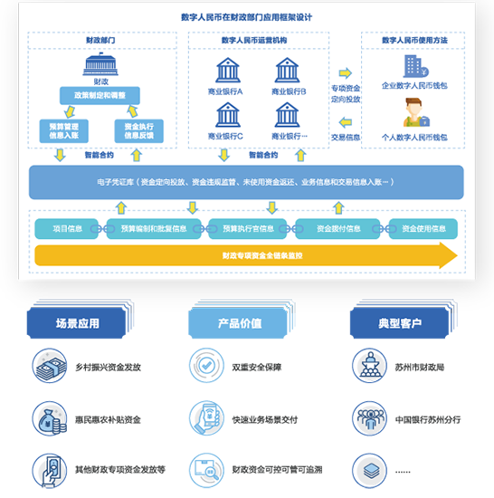 国库集中支付电子化通道作为财政资金的标准安全通道,现已有效衔接财政、人行、代理银行三方,建立了财政资金拨付的安全体系。数字人民币作为一种新型的资金形态,基于智能合约技术,可与电子凭证库进行有效的结合。总体设计上打通财政数字人民币电子化支付通道,构建财政预算管理一体化业务流、电子支付数据流、数字人民币资金流、信息流的全方位业务管理链条,探索“数字人民币+智能合约”在财政支付领域的应用,助力财政资金定向精准拨付,优化财政资金追溯监管,加强财政资金回收利用,提升财政资金拨付效率等,实现财政特色的数字化、透明化和智能化财政管理。